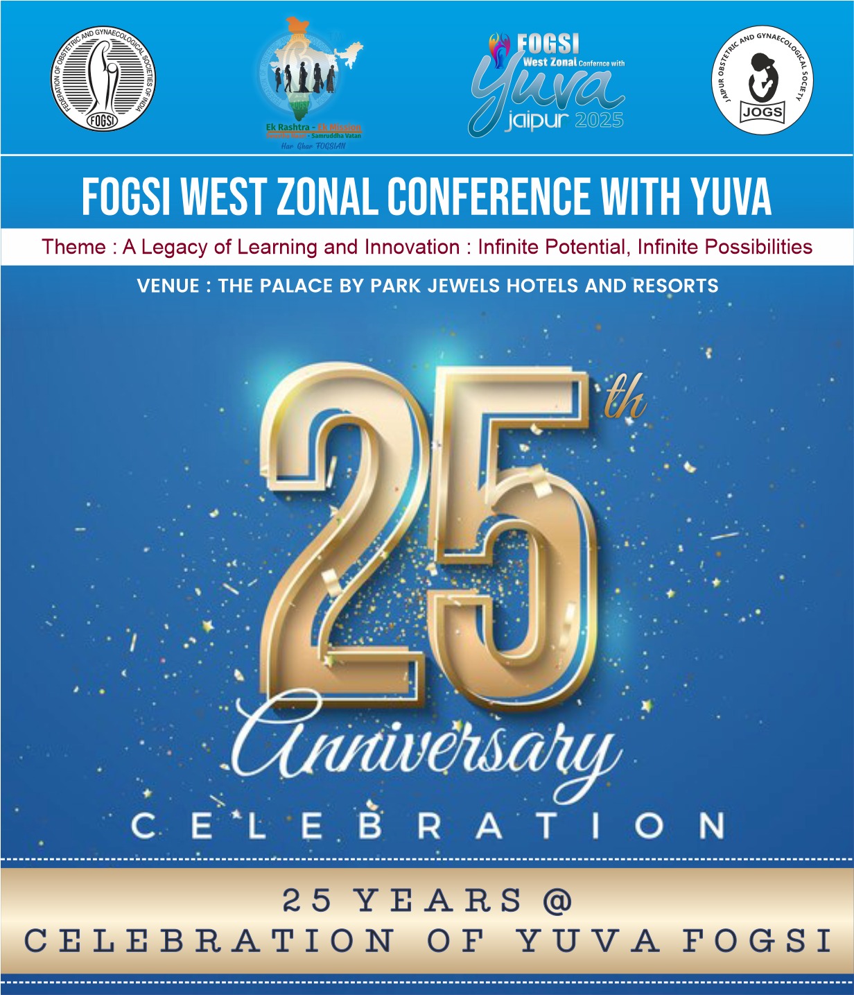 We are pleased to extend a warm invitation to you for the FOGSI West Zonal Conference with Yuva-2025 organized by the Jaipur Obstetric and Gynaecological Society, under the esteemed aegis of the Federation of Obstetrics and Gynaecological Societies of India (FOGSI). The conference will take place on 14th and 15th June 2025 at The Palace - Park Jewel Hotels & Resorts, Jaipur, Rajasthan.